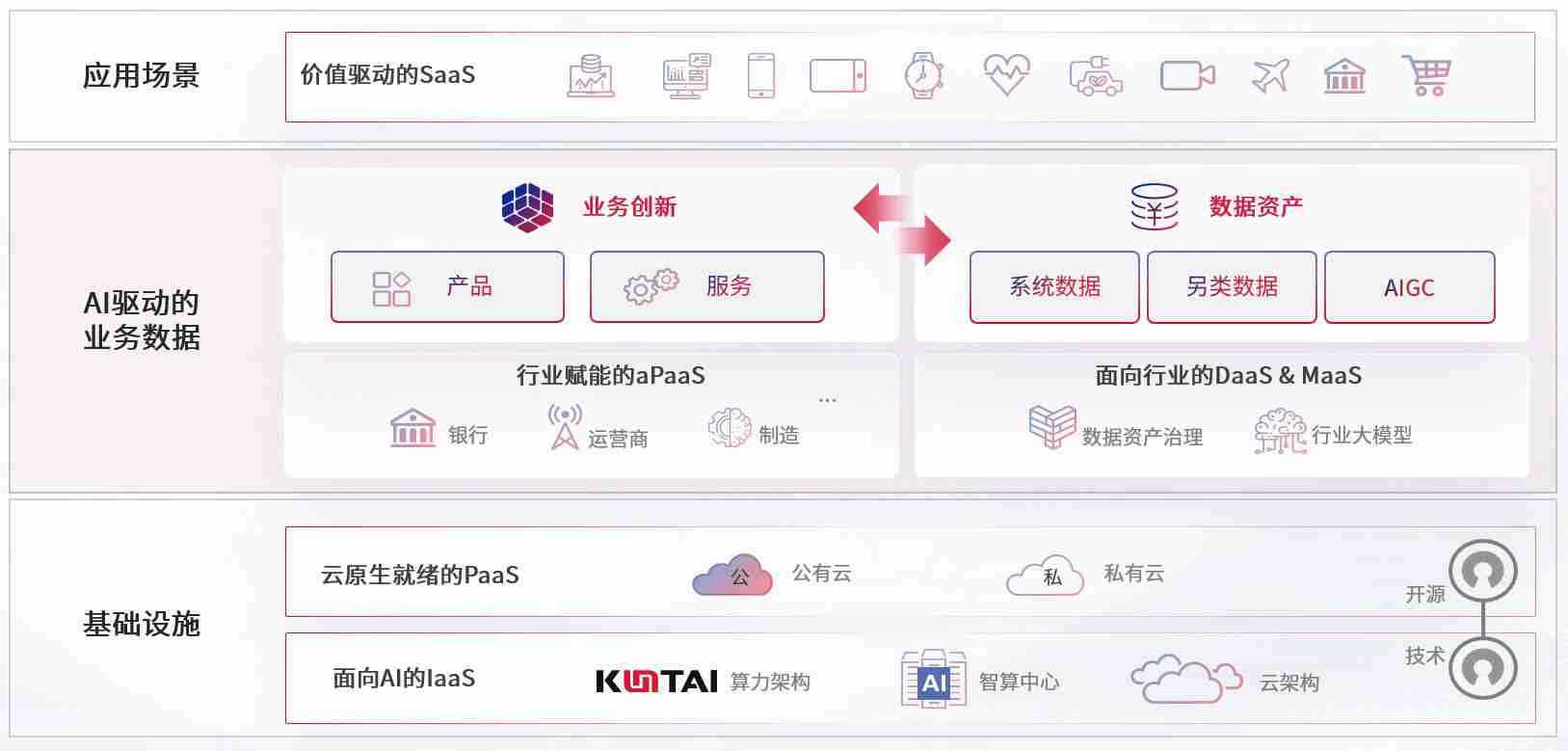数字时代,,,,围绕企业数字化转型的关键要素,,,z6尊龙旗舰厅数码开创性的提出数云融合战略和技术体系框架,,,着力在云原生、、、、数字原生、、AI原生和信创产业上架构产品和服务能力,,,为处在不同数字化转型阶段的快消零售、、汽车、、、金融、、、医疗、、、、政企、、、、教育、、、运营商等行业客户提供泛在的敏捷IT能力和融合的数据驱动能力,,构建跨界融合创新的数字业务场景和新业务模式,,助力企业级客户建立面向未来的核心能力和竞争优势,,全面推动社会的数字化、、、、智能化转型升级。。。。