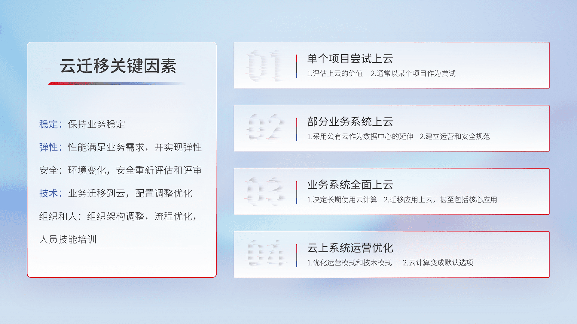 结合实际业务,,,从规划设计、、云平台选型、、云原生改造、、数据迁移、、、、集成交付,,迁移全过程为客户识别最佳上云路径,,,,做好风险识别管理,,,设计网络架构、、、身份权限、、、、安全审计合规、、、、操作审计、、日志审计、、、监控告警策略、、、多站点容灾设计等,,,,对云上基础设施进行整体规划,,提升IT治理水平,,以满足弹性、、高可用、、、、高性能的需求。。。
